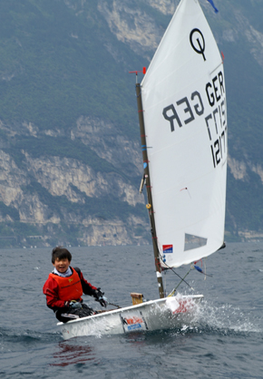 Angespornt durch Tom waren wir in diesem Jahr beim Lake Garda Meeting, der größten Optimisten-Regatta der Welt, die vor 2 Jahren mit 1.200 Teilnehmern sogar einen Eintrag ins Guinness Buch der Rekorde bekommen hat - eine nicht zu unterschätzende Motivation für Batbold, hier auf alle Fälle dabei zu sein… Als Nicht-Kader-Kind war es für uns zunächst aber gar nicht so einfach, eine Gruppe für Training und Betreuung zu finden. So bekamen wir nach einigem Suchen Anschluss beim Münchner Yacht-Club, der über eine Sailing Academy verfügt. Nachdem wir noch am Freitag, 11. April, das Boot im Circolo Vela Torbole entladen und dann erstmal den Ort Torbole (kleiner netter Ortskern, gutes Eis, herrliche Landschaft drumherum) erkundet haben, ging es für Buddy am Samstag um 10 Uhr mit der "Hand am Slipwagen" los. Gemeinsam mit 9 weiteren Kindern aus Süddeutschland konnte das Training in Angriff genommen werden und es wurde hinaus gesegelt. Die Gruppe war Buddy bis dahin völlig unbekannt, dennoch fand er schnell Anschluss und es zeigte sich mal wieder, dass Segelkinder zusammen halten. Da die Kinder im Club mit Mittagessen versorgt wurden, unsere Ferienwohnung für Batbold per Roller erreichbar war, konnten Andree und ich die Tage nutzen, um die Gegend zu erkunden. Es war traumhaft schön, denn uns hat der Wettergott tüchtig verwöhnt. Auch wir hatten mal Hafendienst, aber es war relativ entspannt und nicht wirklich was zu tun. Für Batbold gab es ein super nettes Training, nicht nur auf dem Wasser. Zwecks Stärkung der Kondition wurde das Segeln durch abendliche Fußballspiele (direkt vor der erhöhten Kirche Torboles, von wo aus man einen einmaligen Blick auf den Garda-See hatte) und Klettern auf den Monte Baldo bei Windstille bereichert. Am Tag vor der Regatta gab es noch einen Flaggenlauf durch Riva. Es war beeindruckend zu sehen, wie Kinder aus so vielen verschiedenen Teilen der Welt (Russland, USA, Bermudas, Ecquador, Finnland – um nur einige zu nennen) durch die Gassen Rivas mit ihren Fahnen marschierten und dann vor dem Rathaus offiziell begrüßt wurden. Für Buddy war es dann noch besonders toll, dass die Münchner Kinder gemeinsam nach Riva per Motorboot gefahren wurden… Gekrönt wurde der Ausflug dann noch durch das Wiedersehen mit vielen bekannten Gesichtern aus Niedersachsen. Die Regatta begann dann Gründonnerstag. Beim Lake Garda Meeting findet eine Einteilung nach Alter statt. Die Jahrgänge 2003-2005 gehörten zu den Cadetti und Batbold hatte Glück nur einer von zwei Cadetti zu sein, die von einem Trainer betreut wurden. Wenn das kein Luxus ist! Freitag waren die Kinder leider erfolglos auf dem Wasser. Aufgrund unvorhersehbarer Winde, wurden drei Rennen der Cadetti abgebrochen bevor man für den Tag die Regatta ganz aufgegeben hat. Dafür ging es dann am Samstag mit der Qualifizierungsrunde weiter. Anschließend wurden die Gruppen nach Punkten eingeteilt und am Sonntag gab es dann noch zwei Wettfahrten (für Batbold in der Silbergruppe). Dazwischen haben die Münchner Kinder noch während einer sehr langen Pause von einem Vater per Motorboot Eis gebracht bekommen. Persönlicher Höhepunkt war für Batbold dann das letzte Rennen, wo er es als zweiter durch die Ziellinie schaffte - ein einmaliges Erlebnis. Somit wurde er insgesamt 10ter in seiner Gruppe und bekam bei der Siegerehrung noch ein großes Osterei. Das Strahlen ist seitdem auf dem Gesicht unseres Sohnes nicht mehr wegzudenken. Das Wetter während der 9 Segeltage war kein Vergleich zum letzten Jahr, denn es gab fast immer Sonnenschein. Besonders spannend war wohl, dass wir dennoch viele unterschiedliche Wetterarten erleben konnten. So gab es mal Wind und Welle, mal einen spiegelglatten See und auch ein bisschen Regen war mal dabei. Abends gab es auch zwei Mal ein gemeinsames Essen mit den anderen Kindern, Eltern und Trainern und es war insgesamt eine sehr gesellige und nette Runde. Für Batbold steht fest: Nächstes Jahr wieder!! Und auch für uns gibt es noch viele unentdeckte Ziele in der Region, die wir dann erkunden wollen. Zeitungsbericht in der NWZ unter: